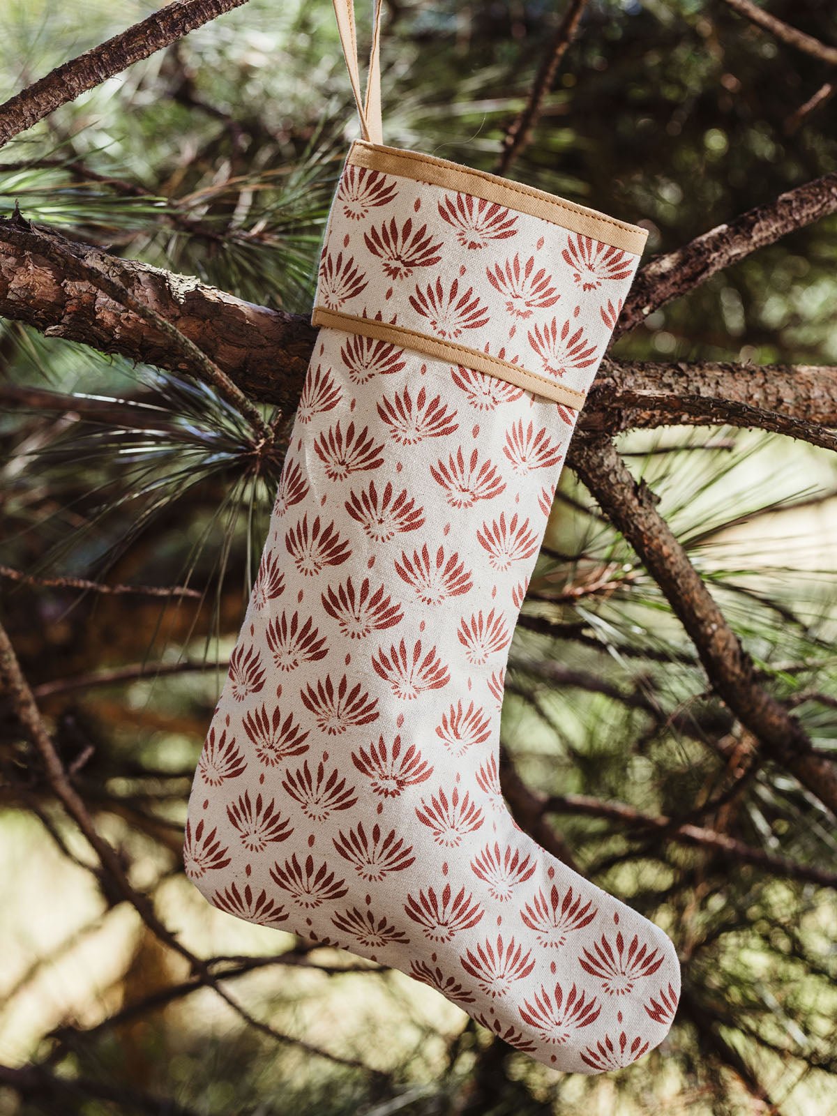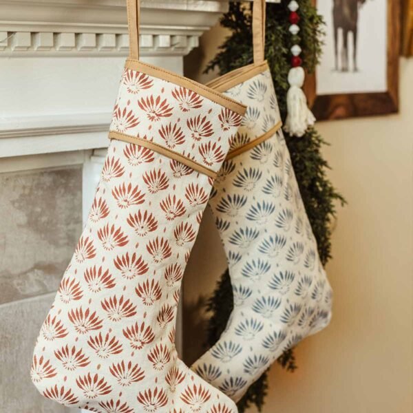 Bring festive sophistication home with the Handmade Christmas Stocking in our Forest Print pattern. available in Rust or Sky Blue. Each stocking is hand block-printed with a repeating forest design on durable cotton canvas and finished with contrasting piping for a simple yet elegant look. Complete with a cotton lining and sturdy hanging hook. these fair-trade certified stockings are both practical and beautiful.?